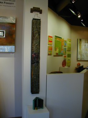 Beyond the Day Acrylics/mediums, image transfers, sewing pattern pieces,brass filings, key shavings, glass pieces, metal pieces, crumbled sandstone, leaves. found metal objects found objects, pencils, twigs, wire on metal; green metal box with image transfers, red beads, marigold 8” x 56” x 6” Cross Culture, Art Crank Caminata, Art displayed at High Desert Gallery